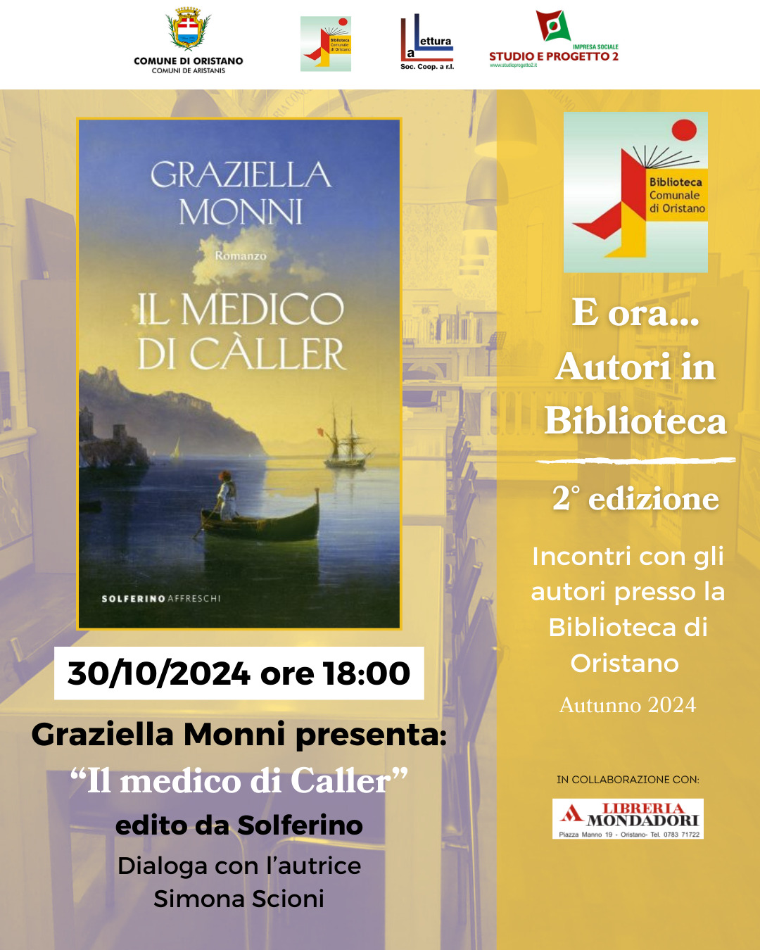 E ora...autori in biblioteca ostita l'autrice Graziella Monni con il suo libro "Il medico di Caller" edito da Solferino, dialoga con l'autrice Simona Scioni. In collaborazione con la Libreria Mondadori
