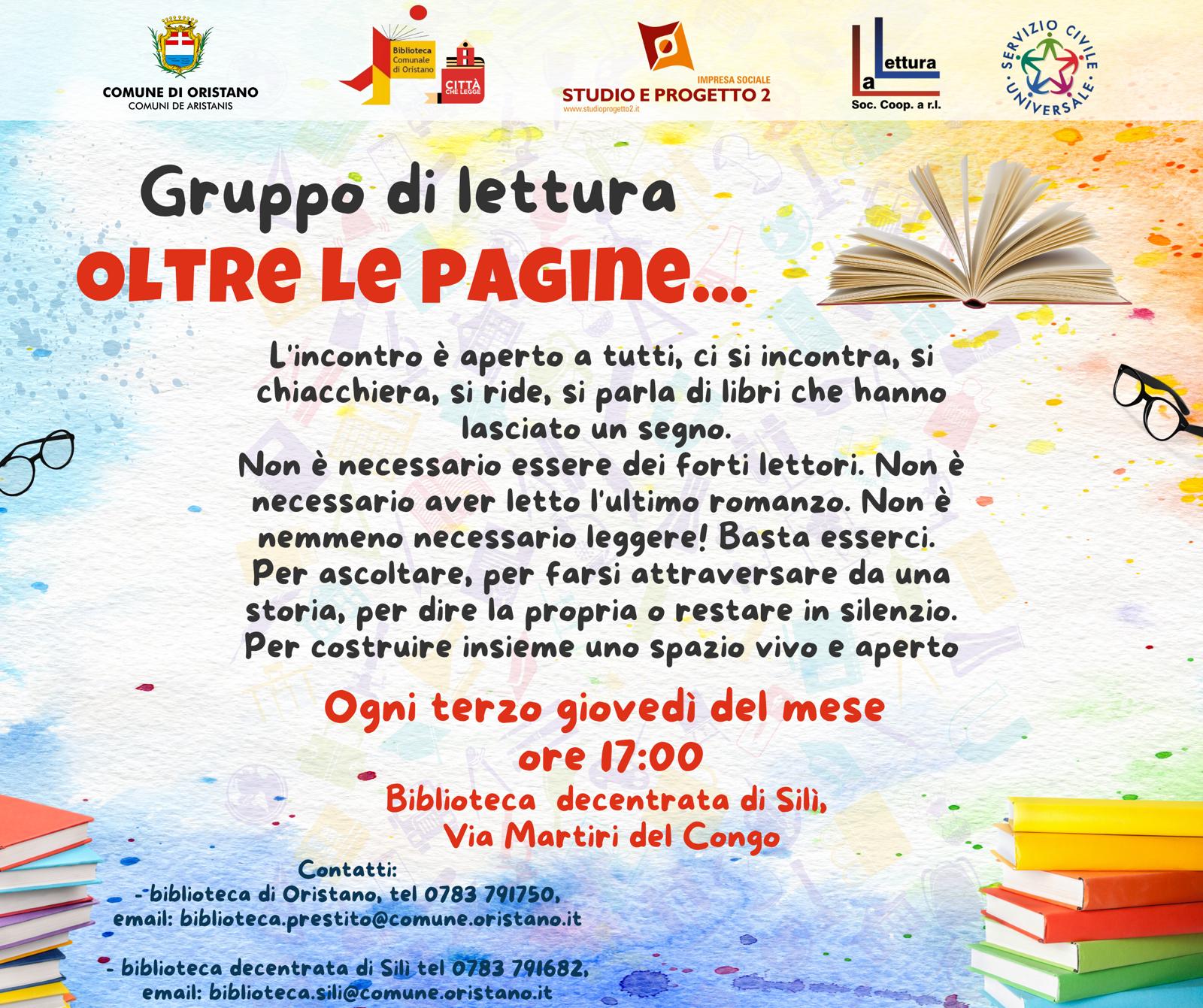 L'incontro è aperto a tutti, ci si incontra, si chiacchiera, si ride, si parla di libri che hanno lasciato un segno. Non è necessario essere dei forti lettori. Non è necessario aver letto l'ultimo romanzo. Non è nemmeno necessario leggere! Basta esserci. Per ascoltare, per farsi attraversare da una storia, per dire la propria o restare in silenzio. Per costruire insieme uno spazio vivo e aperto. Ogni terzo giovedì del mese ore 17. Biblioteca decentrata di Silì, Martiri del Congo.