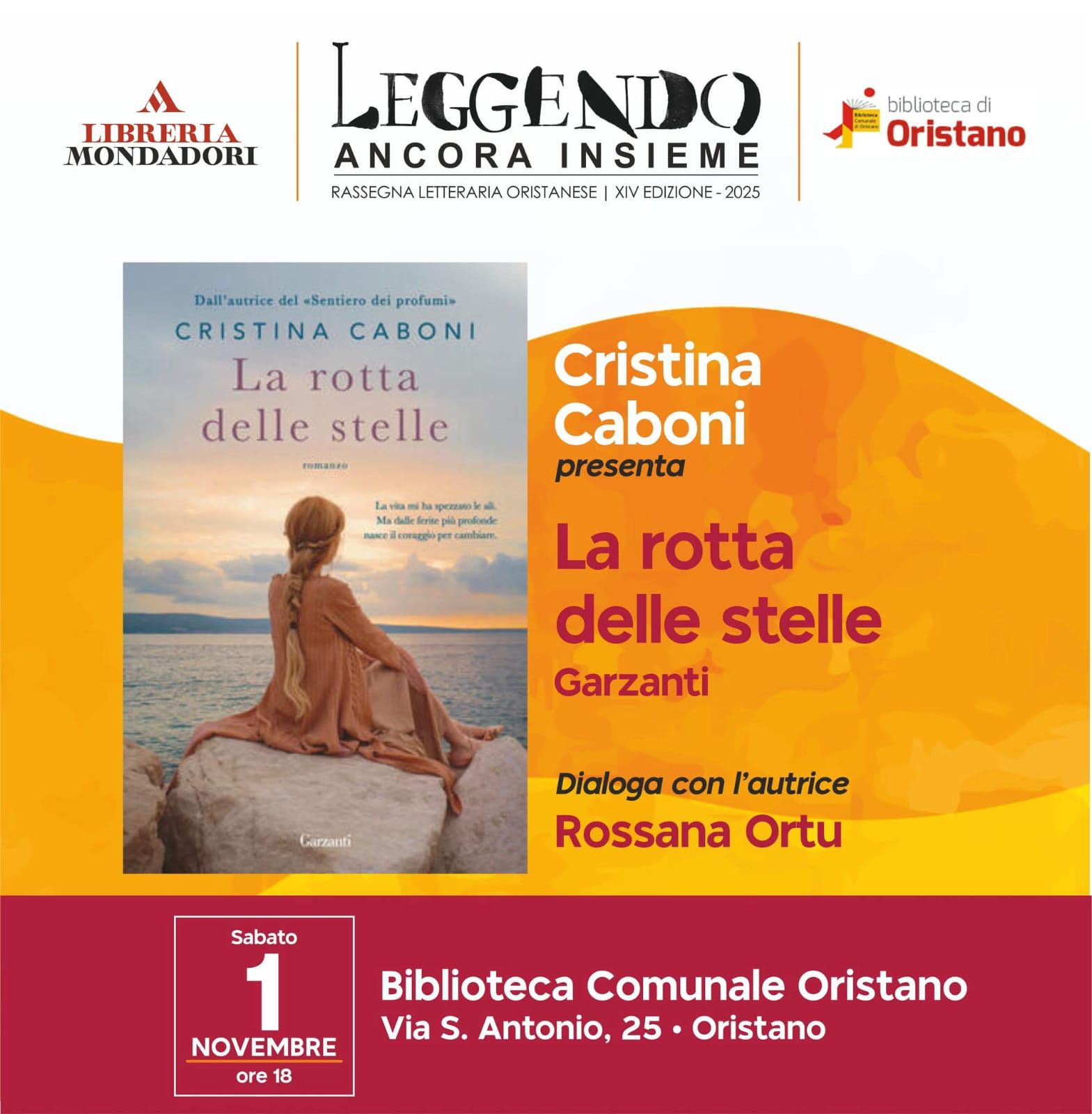 Cristina Caboni sarà ospite a Oristano con il suo nuovo libro "La rotta delle stelle", Garzanti Libri, sabato 1 novembre 2025 alle ore 18:00 alla Biblioteca Comunale di Oristano, con Rossana Ortu. In collaborazione con la Libreria Mondadori